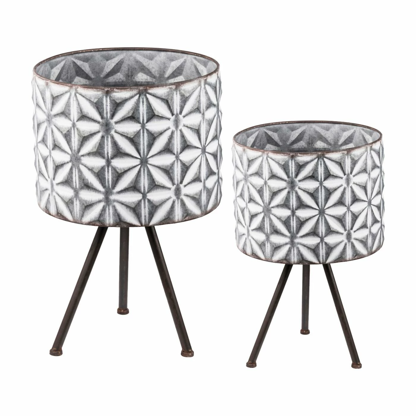 Turn any plant into an instant focal point with the A and B Home Round Planter on Tripod Iron Stand – Set of 2. This pairing of metal planters feature a raised geometric design with white highlights for added appeal. A tripod stand elevates each pot and provides a rustic finishing touch.