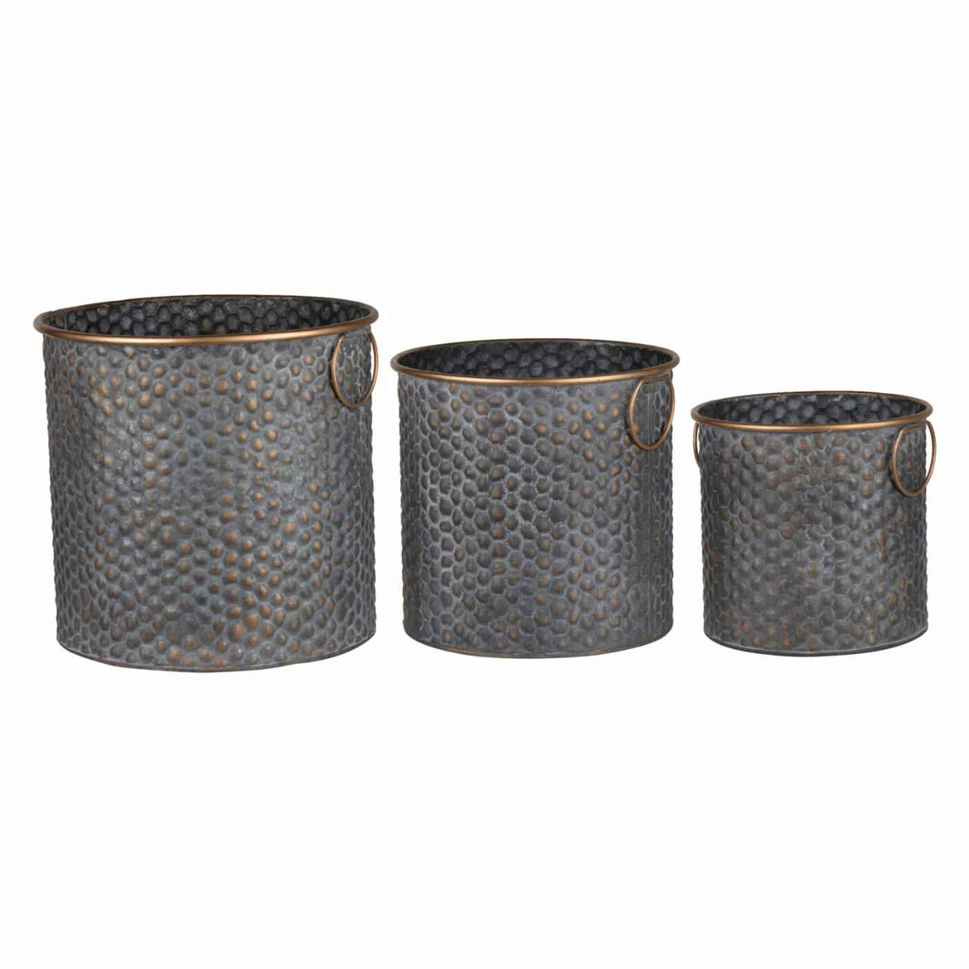 Fill the A and B Home Seneca Metal Planters – Set of 3 with growing plants to create a lovely floral display. This set includes three differently sized planters crafted from hammered metal with an antique copper trim.