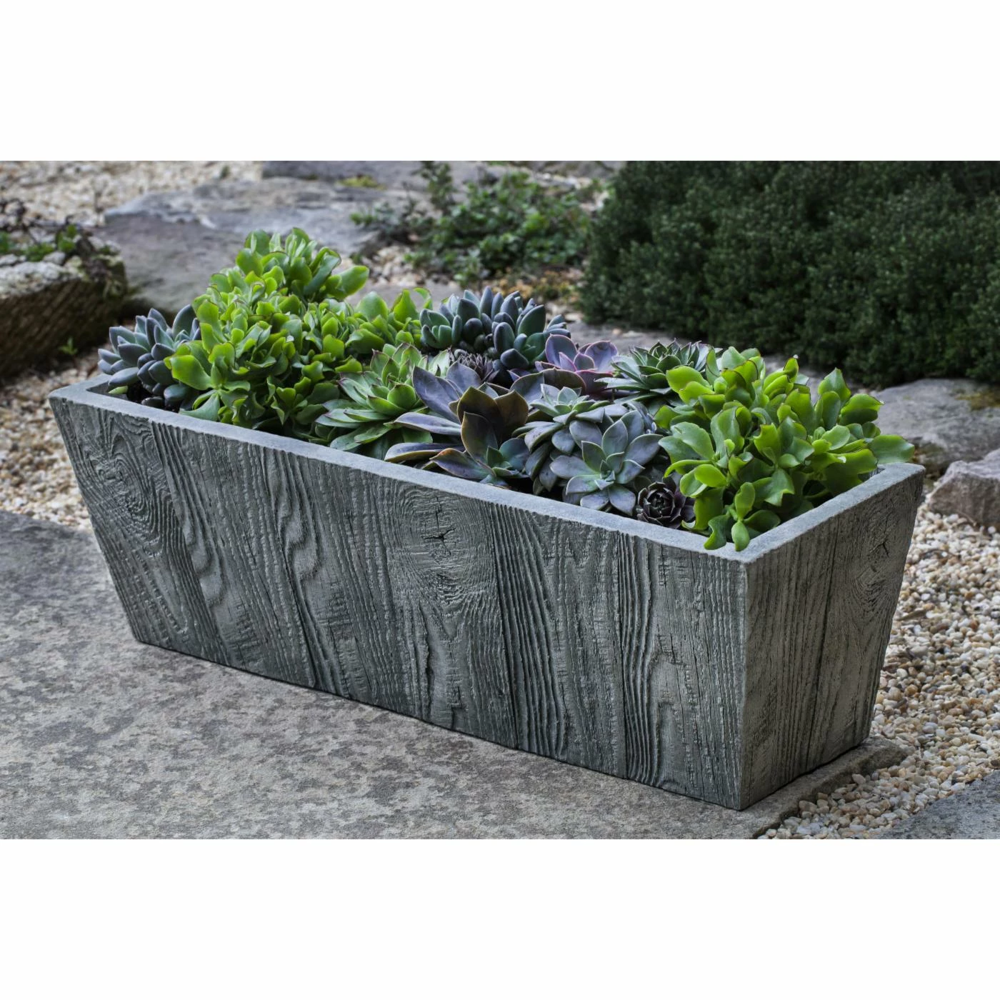 Introduce the texture of a weathered wood grain to your outdoor space with the Campania International Barn Board Tapered Trough. Although this hand-finished planter resembles distressed reclaimed wood, the trough is actually fashioned out of cast stone, making it impervious to rot, warping, and pests. The trough arrives ready for use with pre-drilled drainage holes.