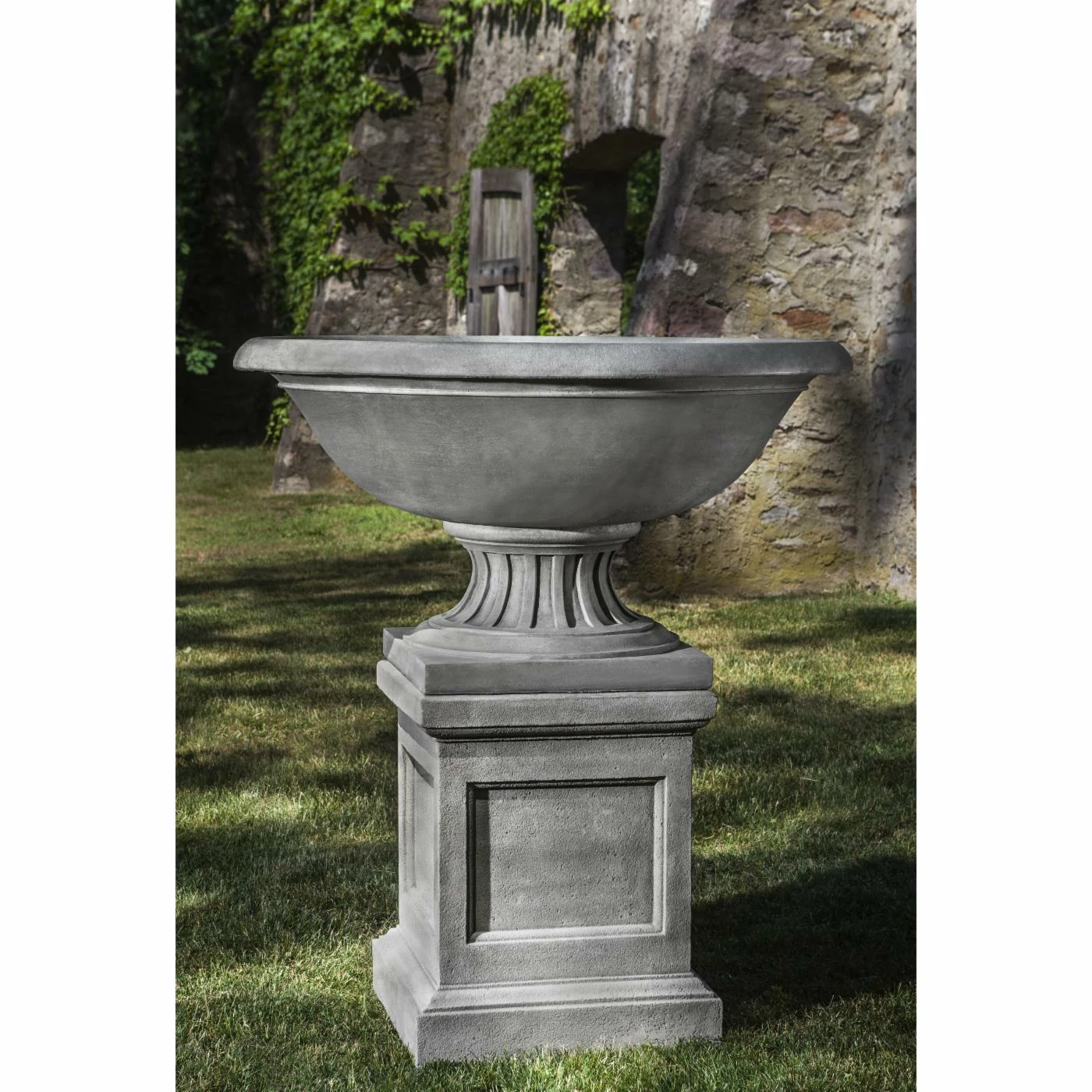 Enhance your driveway, garden walkway, yard, or entryway with the Campania International Fonthill Urn Planter with Pedestal. This stately set includes a wide urn planter with a fluted base and a regal pedestal with recessed panel accents. Both pieces are constructed out of heavy-duty cast stone and patinated by hand to ensure quality.