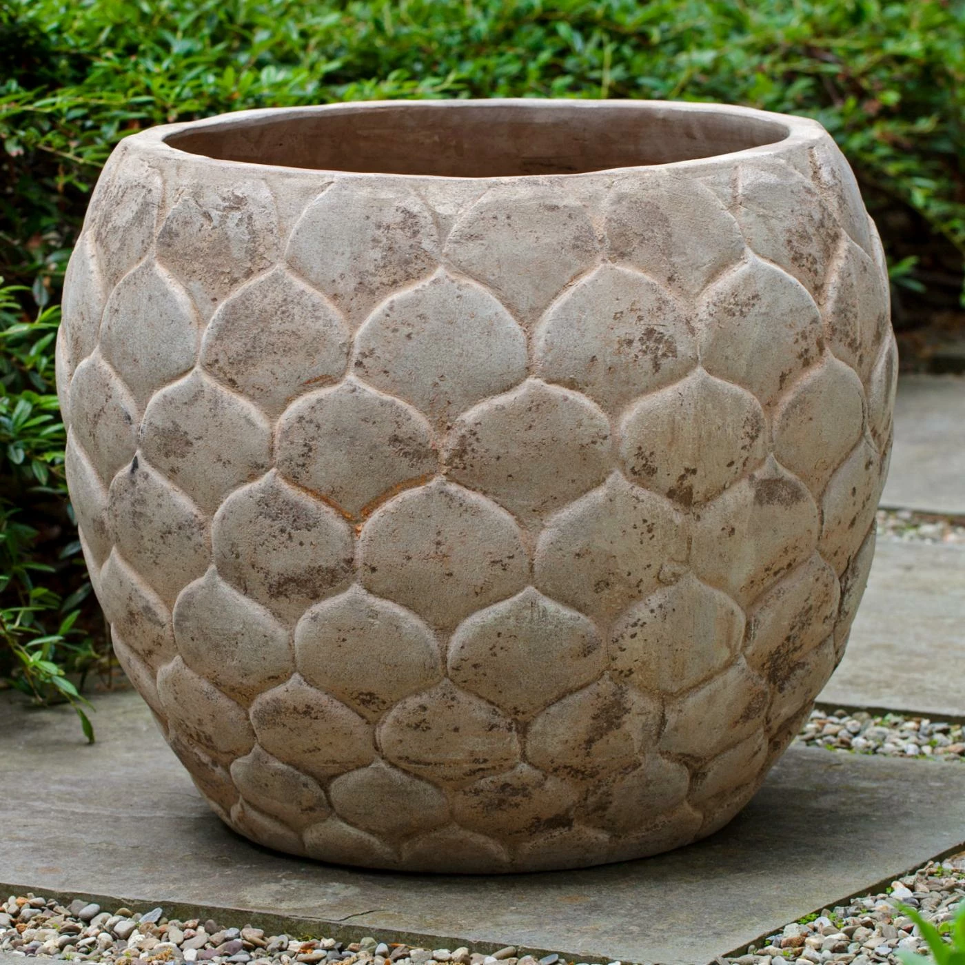 The stylized fish scale texture on the Campania International Pina Fish Bowl Planter – Set of 3 is enhanced by its antico terra cotta finish. This set includes three planters of various size. Each is hand-made of terra cotta clay, hand-finished, and high-fired for durability and frost-resistance.