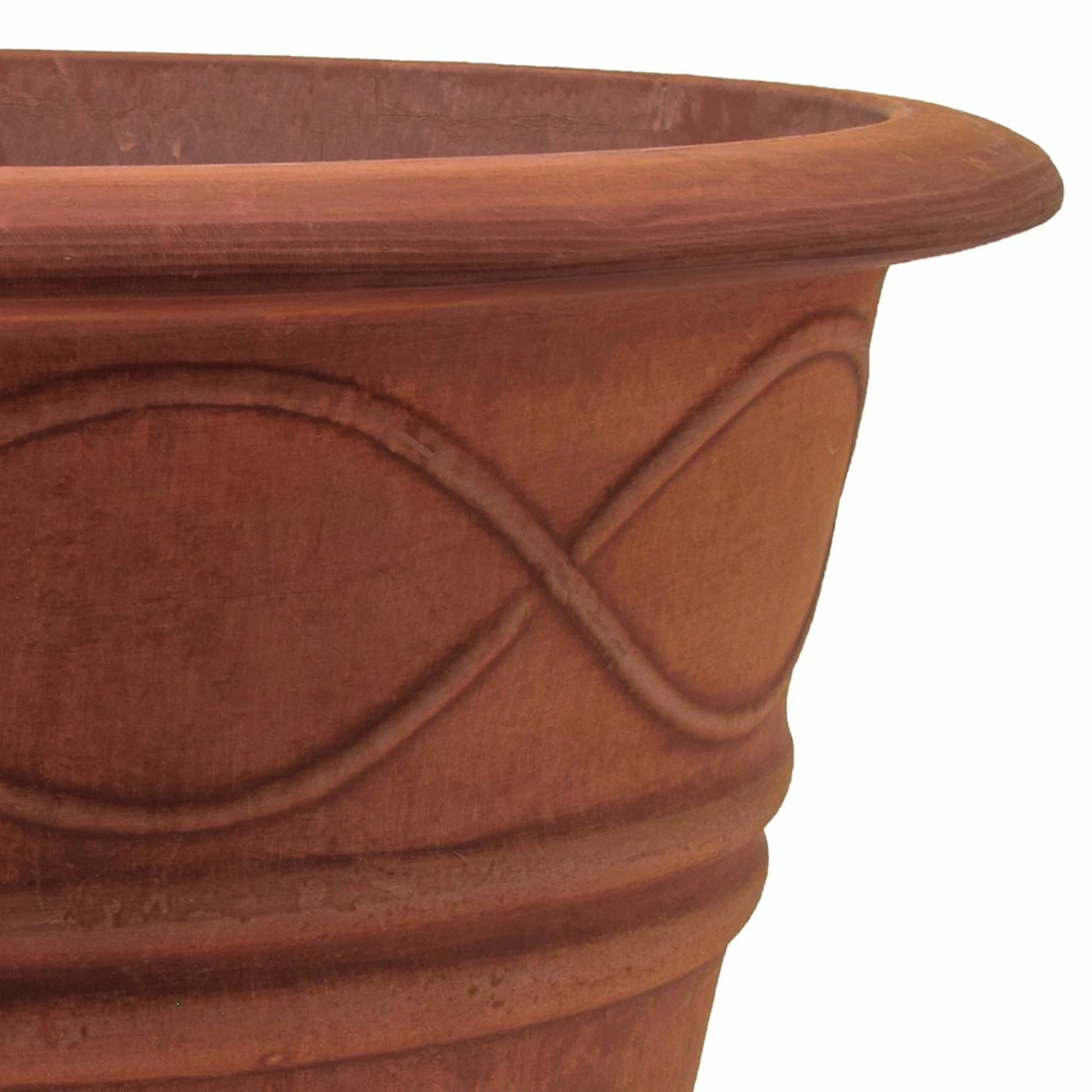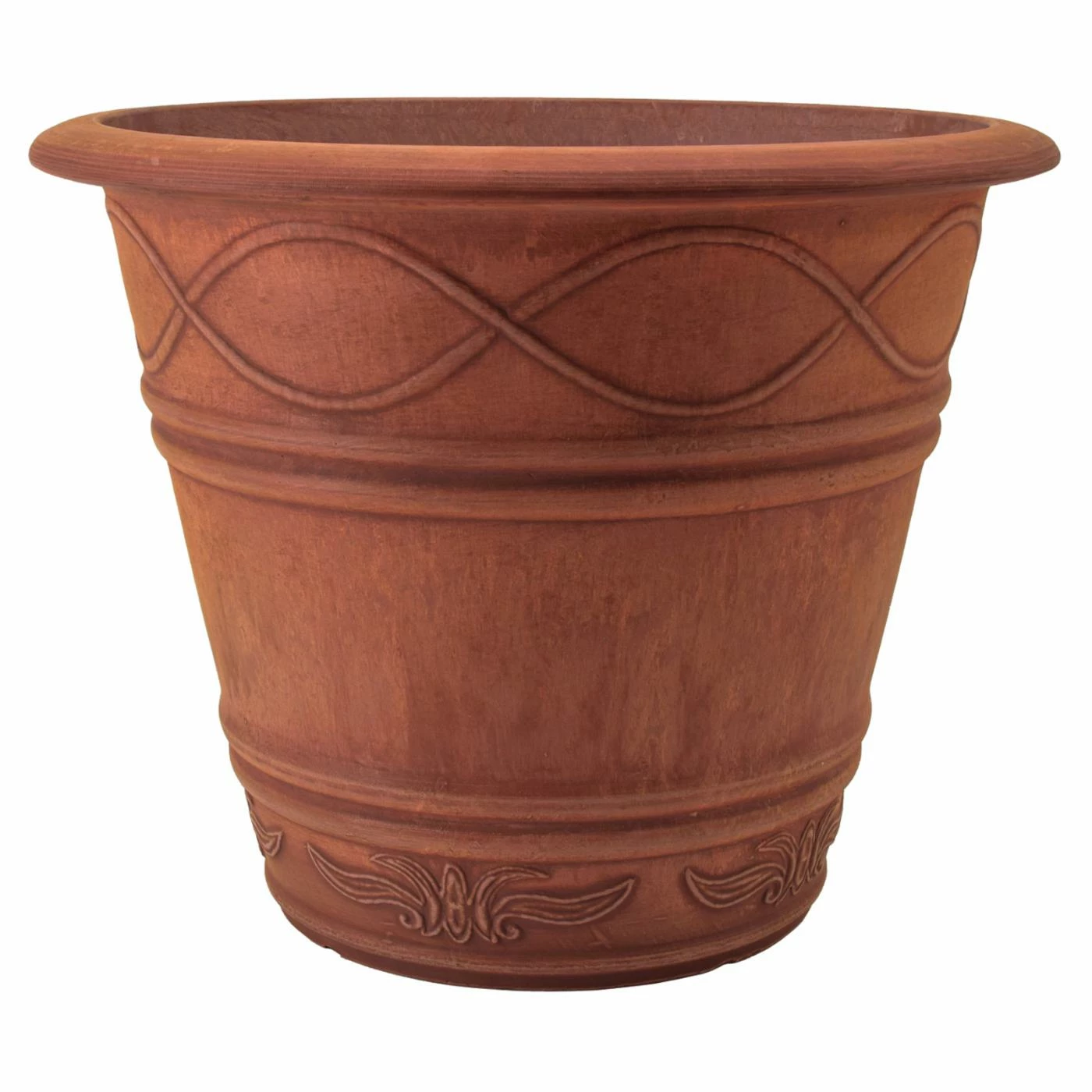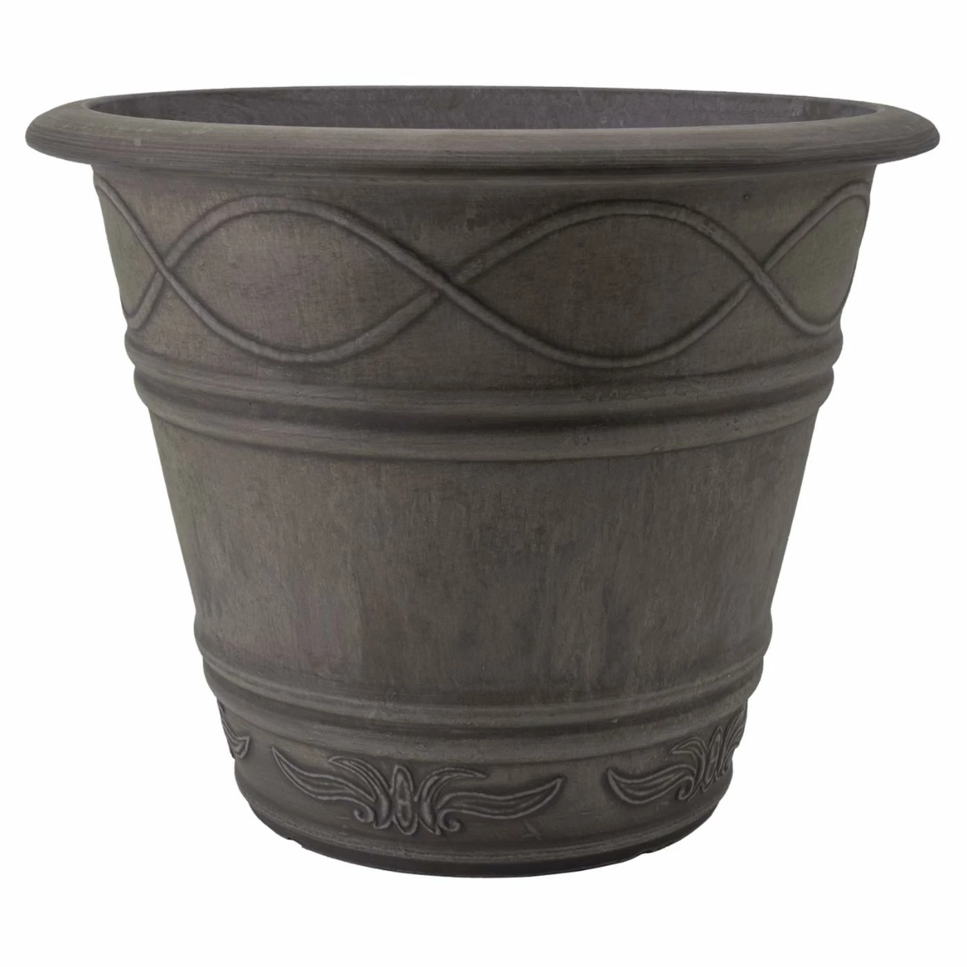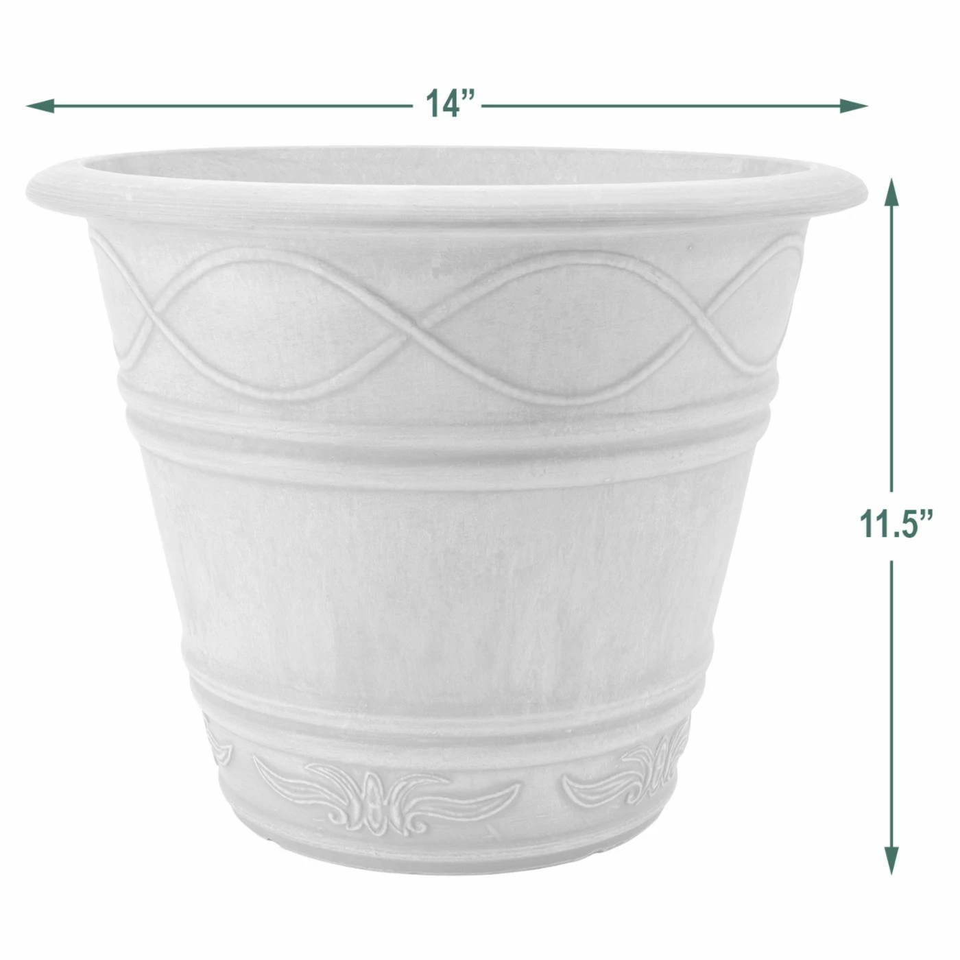 The Arcadia Garden Western Weave Pot 14 diam. x 11.5H in. is equal parts decorative and durable. It’s constructed of recycled plastic, stone powder, and wood dust for eco-friendly durability, even in winter freezes. A wavy motif adorns this pot, which is offered in your choice of available color.