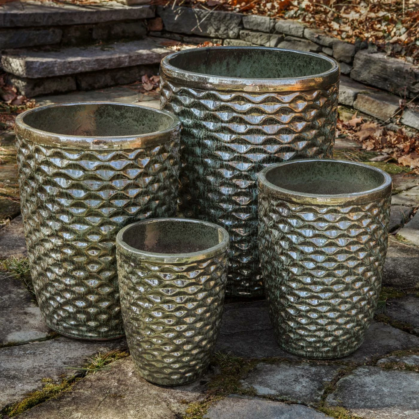 The deep honeycomb texturing and tall stature of the Campania International Honeycomb Tall Round Planter – Set of 4 elevates your landscape design. This set includes four tall planters that are hand-made of terra cotta clay, hand-glazed in your choice of colors, and high-fired for frost resistance and extreme durability.