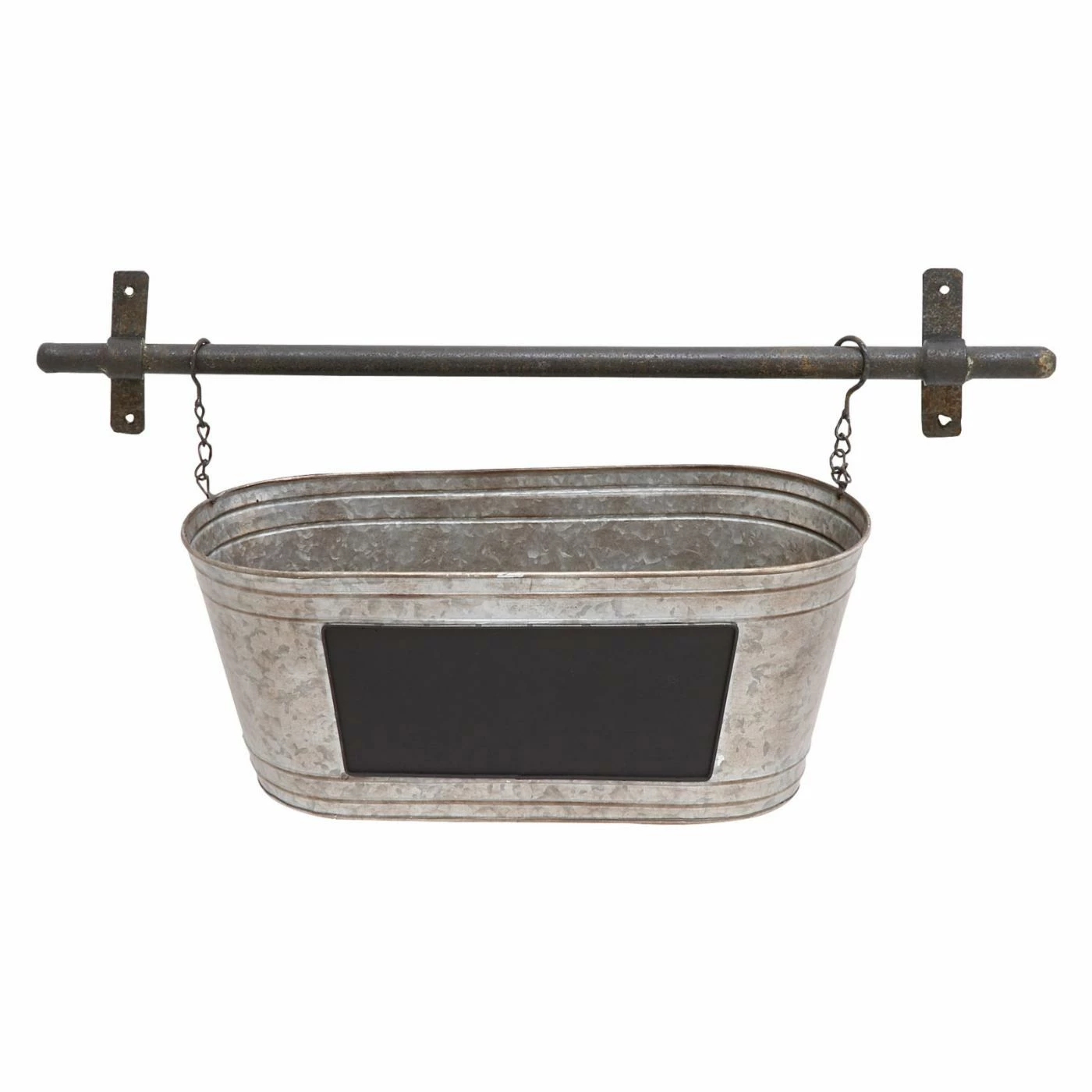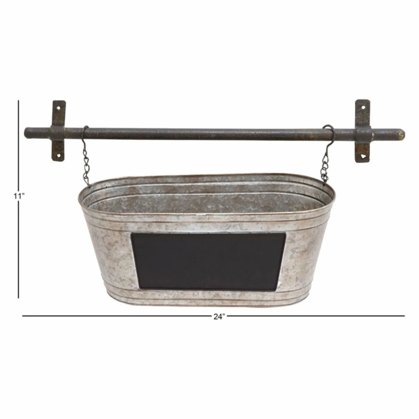 Fill this DecMode Metal Wall Planter with a collection of your favorite herbs, flowers, or vegetable plants to a modern industrial look. The planter features a sturdy black iron mounting bar and hooked chains for easy hanging. The rustic, oval-shaped tub boasts a distressed gray finish and blackboard front for personalization.