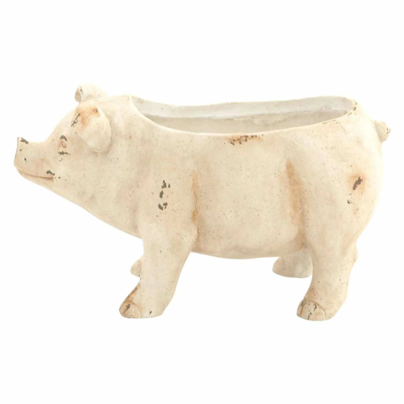 The DecMode Polystone Smiling Pig Flowerpot in Antique Ivory gives you a truly whimsical way to plant your favorite greenery or flowers. This adorable little pig is standing with a planting bed on its back, and the distressed ivory finish adds a touch of rustic appeal. The durable ceramic construction has a stone finish for a substantial look and feel that will bring plenty of smiles to your garden.