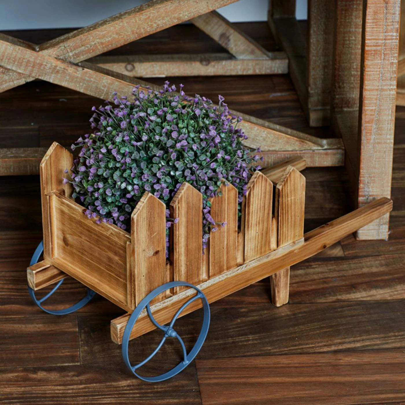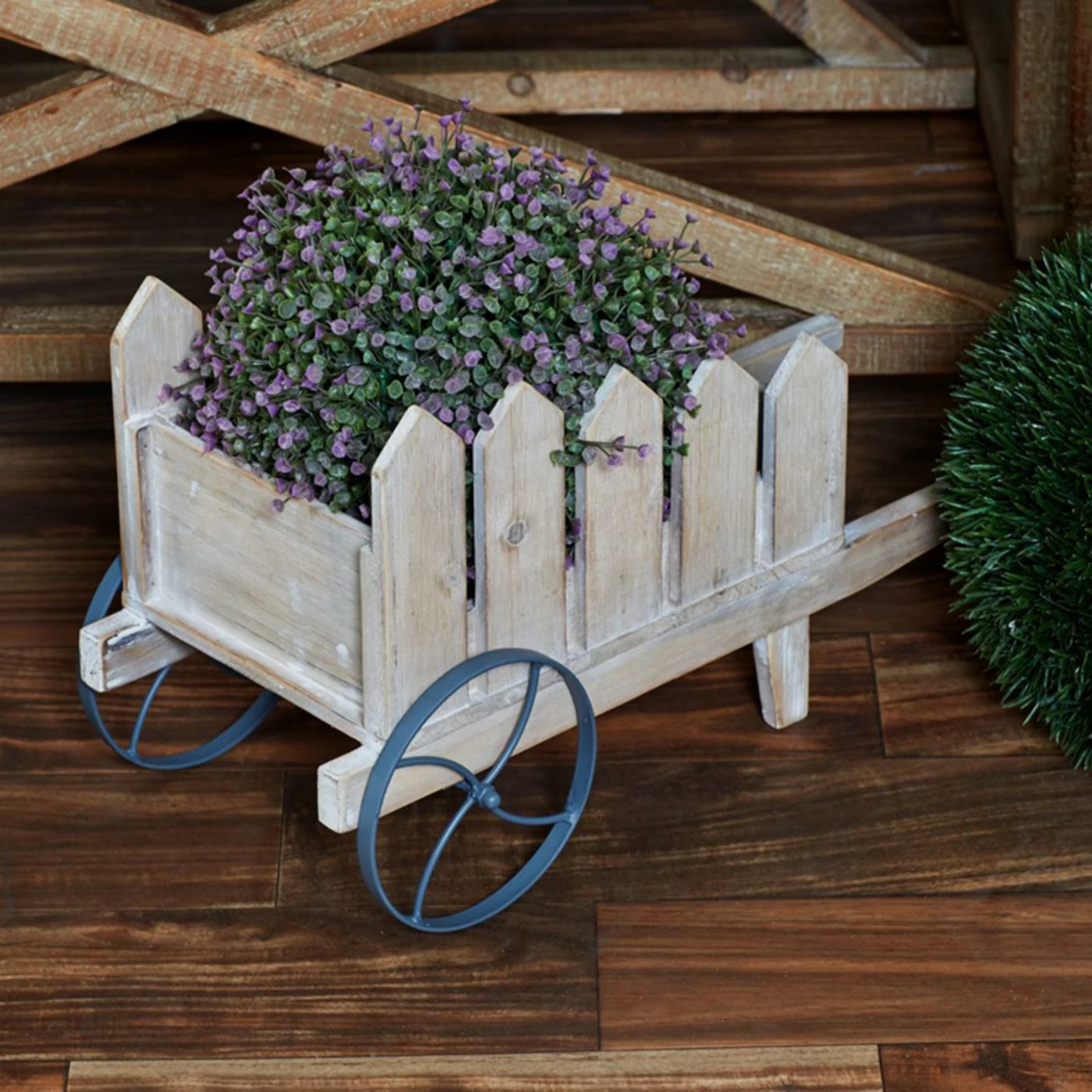 A wooden picket fence design brings the DecMode Traditional Wood and Iron Picket Fence Flower Cart Planter plenty of classic rustic charm. This durable flower cart planter is enlivened in your choice of available finish and includes iron wheels. A wheelbarrow style silhouette makes it the perfect choice for fans of farmhouse style.