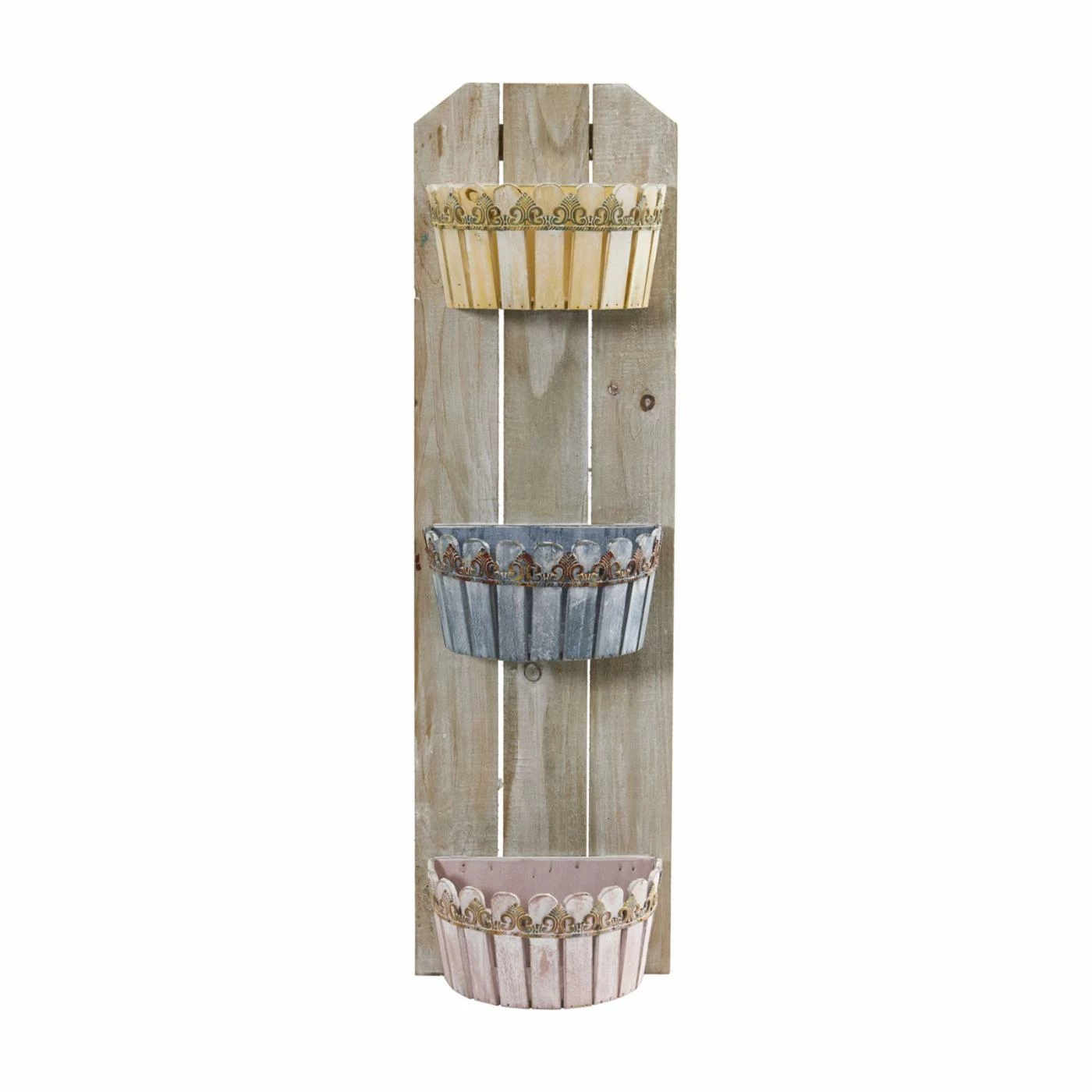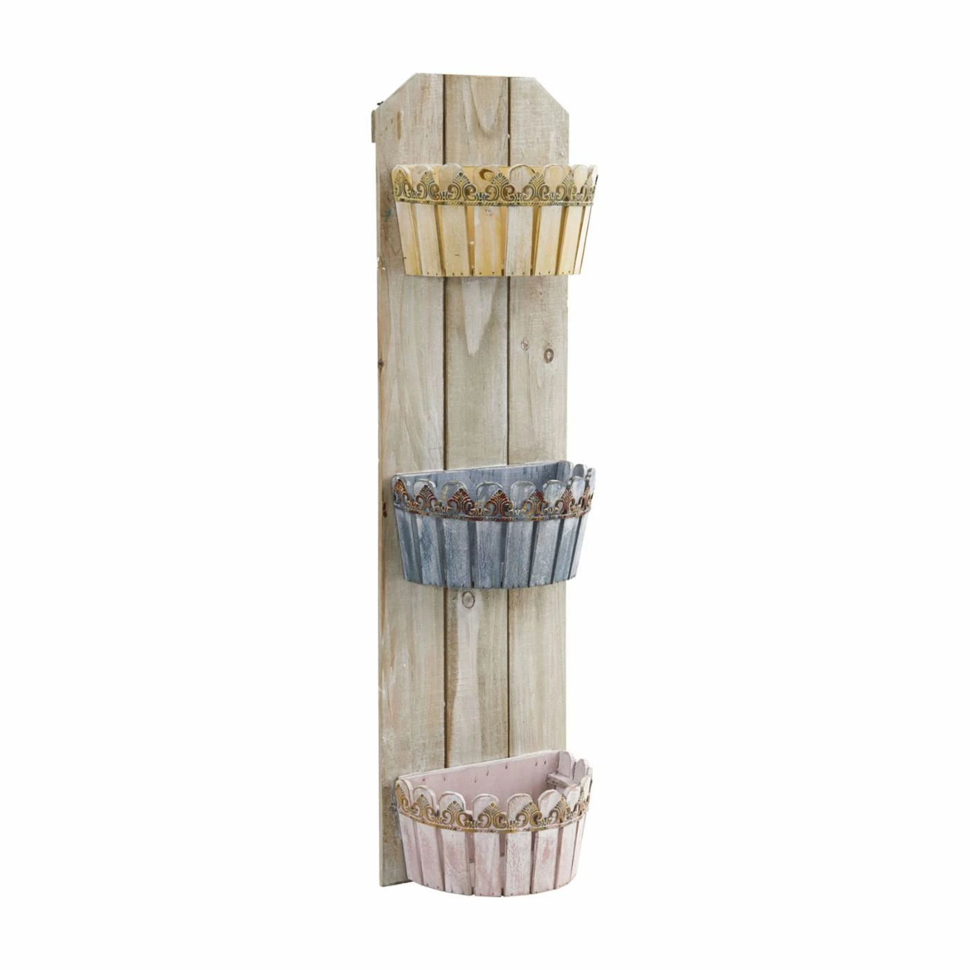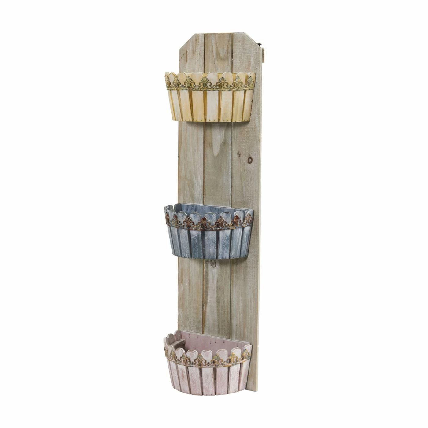 Show off your green thumb in rustic style with the Nearly Natural Triple Wall Planter, which features three different-colored planters that are attached to distressed wooden slats. This charming wall planter adds a sweet aesthetic to any space and can be filled with your choice of herbs, greenery, or flowers.