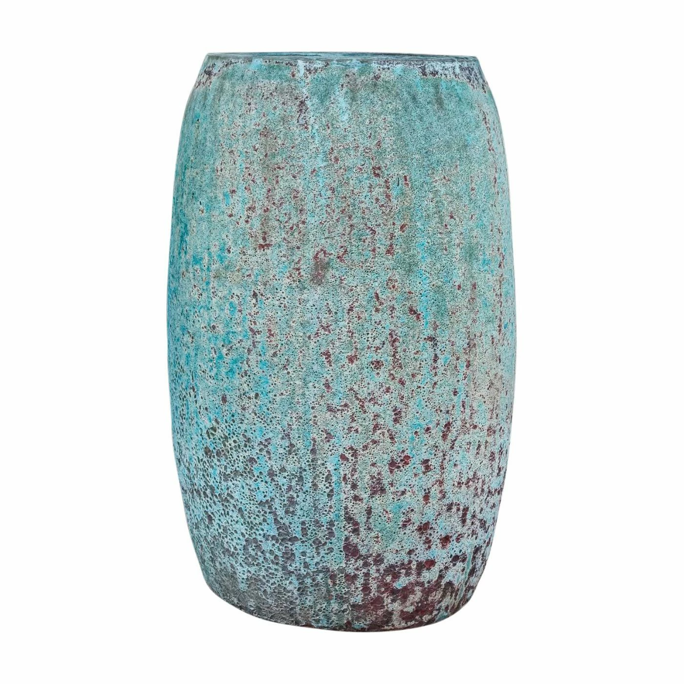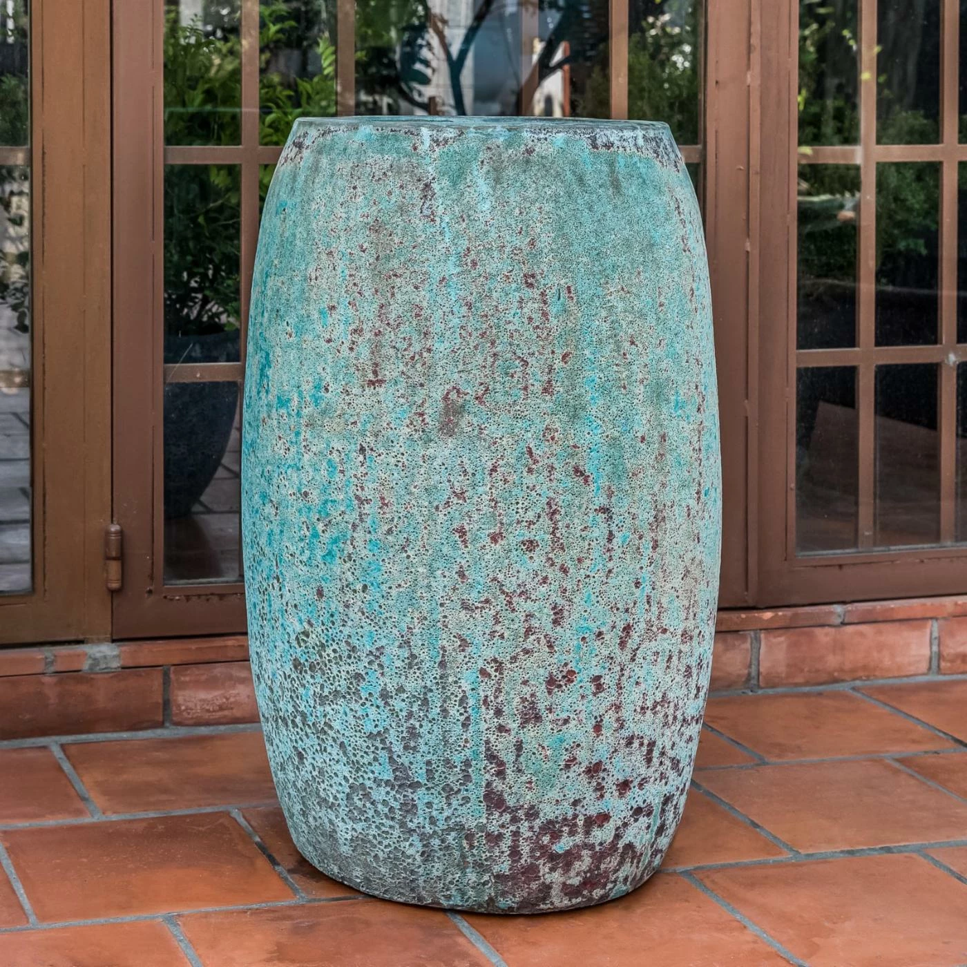 The Campania International Eden Planter showcases a tall, cylindrical shape with gently-contoured walls. This planter is topped by a rimless opening and features a spacious interior. The outside of this planter is accented by textured details that give it a distressed appearance.