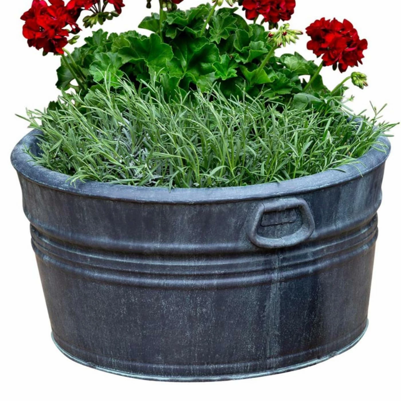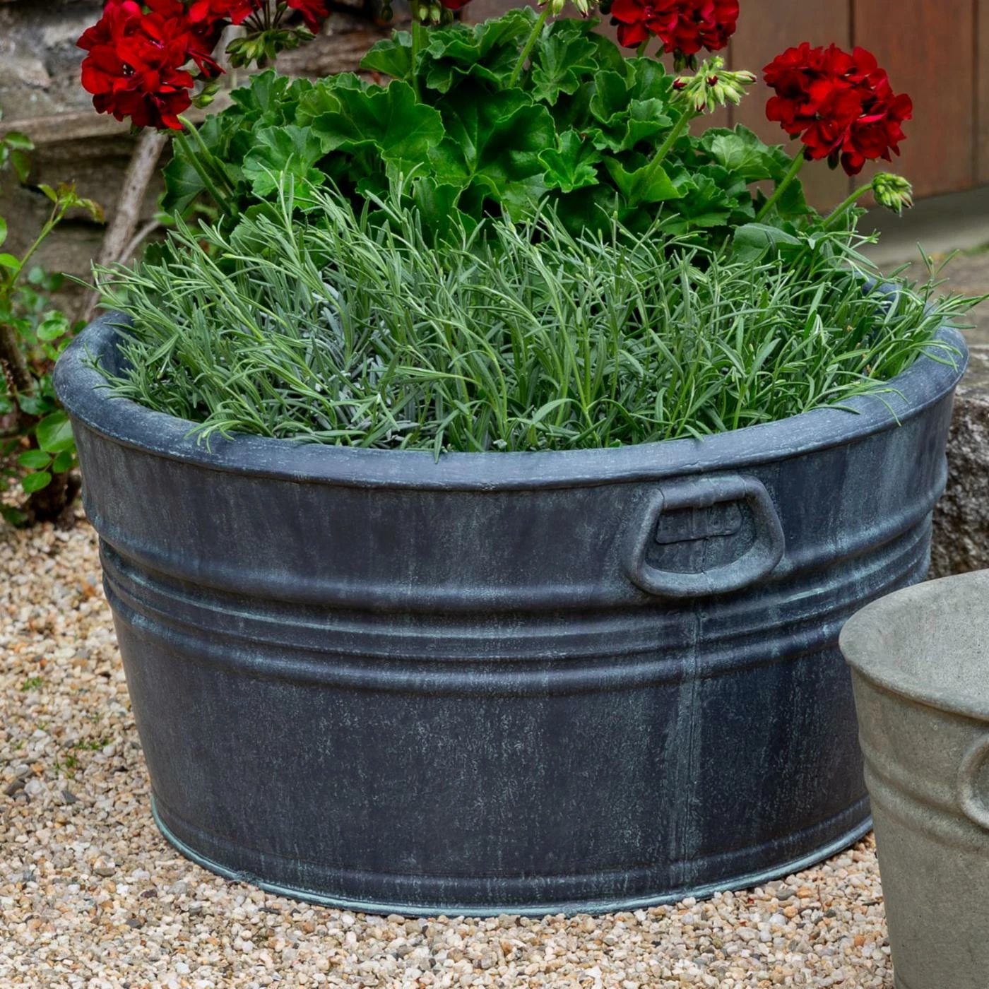 Plant something flowery in the Campania International Large Farm Tub Planter and style on your front porch for a friendly way to welcome guests to your country home. High-density cast stone and a drainage hole in the base make this wash tub planter ready for life outdoors. Choose from available hand-applied natural pigment stain options.