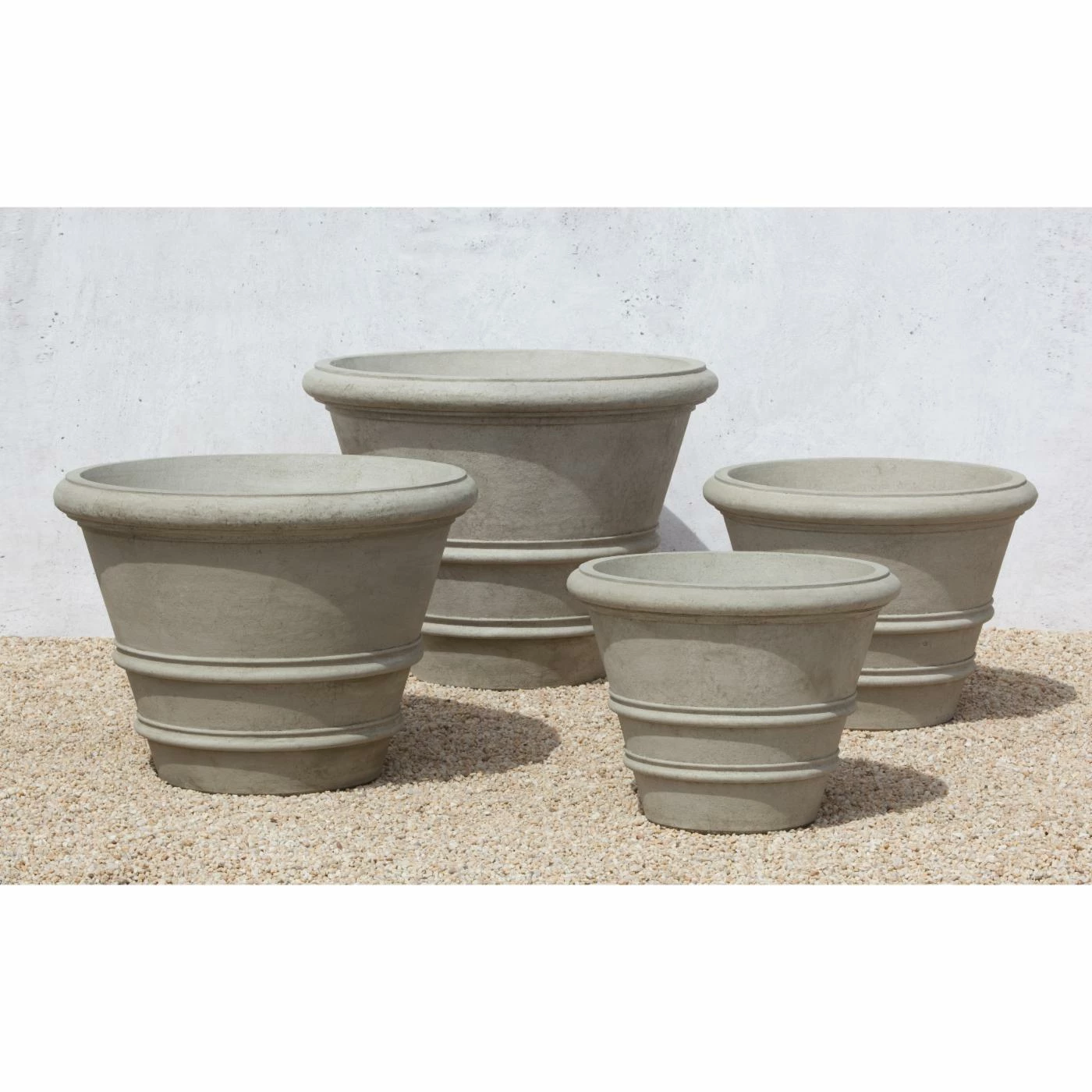 The Campania International Rolled Rim Planter exudes elegance from the top of its rolled rim to the bottom of its hand-finished body. Deep grooves add textural appeal to the durable, weather-ready cast stone planter. Plant care is made simple by drainage holes drilled into the base.