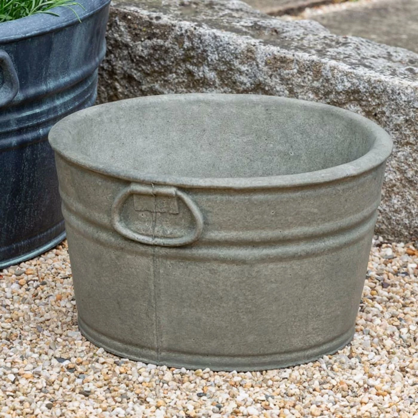 A realistic vintage wash tub look makes the Campania International Small Farm Tub Planter a good match to your farmhouse vibe. Plant something green or flowery in this outdoor-friendly planter. It’s built of cast stone, has an integrated hole in the base for proper drainage, and is offered in a choice of available hand-applied natural pigment stain colors.