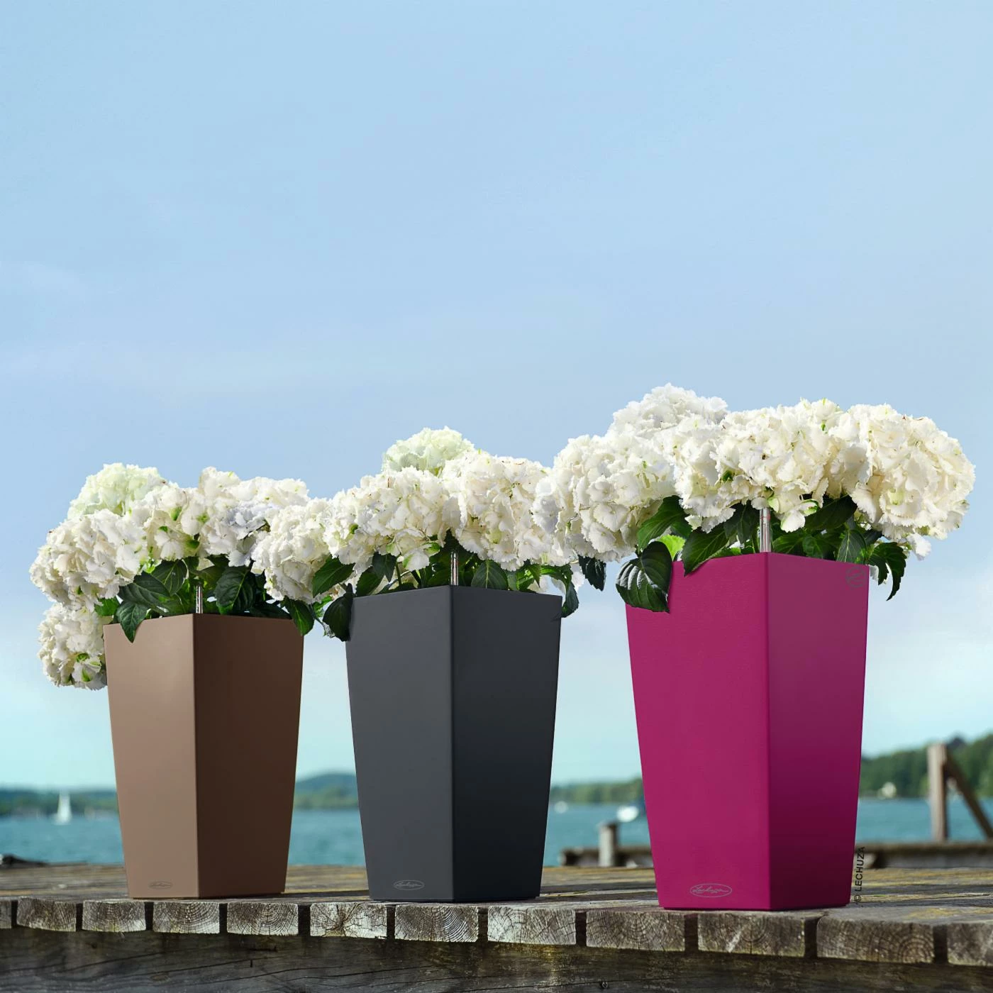 This modern, cube-inspired planter uses a self-watering, sub-irrigation system to nourish your plant. The included separator piece forms a reservoir in the base of the removable planter liner. A supply shaft with water level indicator runs along the inside edge of the liner, making it easy to add water and liquid fertilizer while maintaining complete watering control. A layer of LECHUZA-PON granulate drainage material lies on top of the separator and regulates the amount of water your plant receives – no more rotten roots!