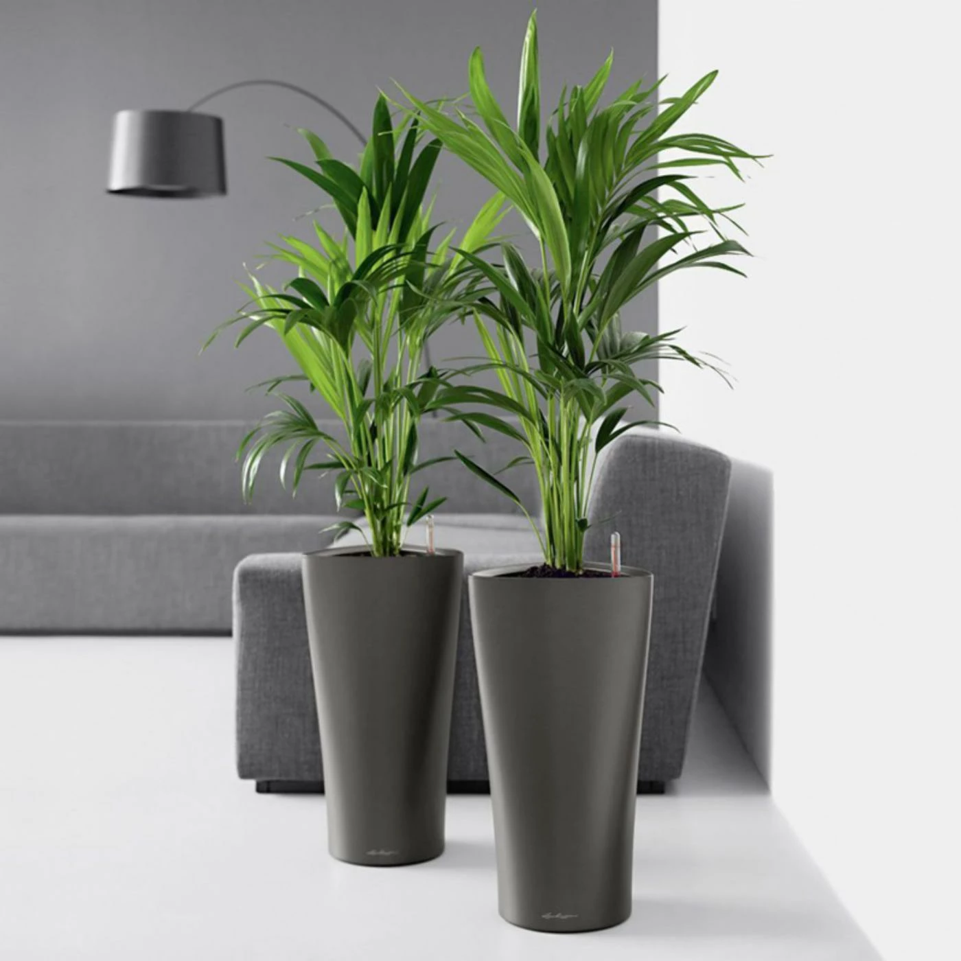 This modern planter uses a self-watering, sub-irrigation system to nourish your plant. The included separator piece forms a reservoir in the base of the removable planter liner. A supply shaft with water level indicator runs along the inside edge of the liner, making it easy to add water and liquid fertilizer while maintaining complete watering control. A layer of LECHUZA-PON granulate drainage material lies on top of the separator and regulates the amount of water your plant receives – no more rotten roots!