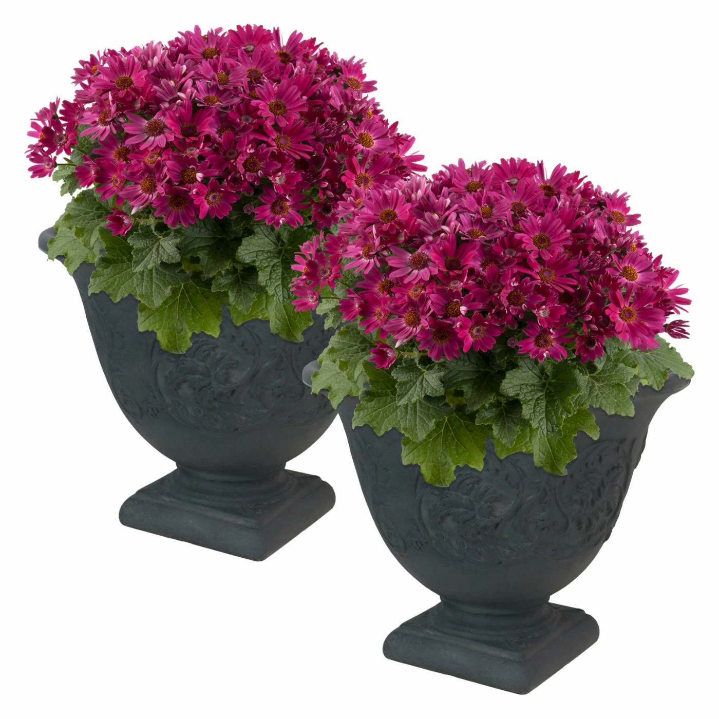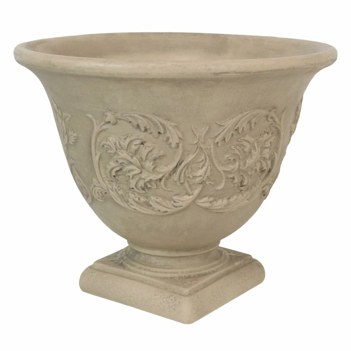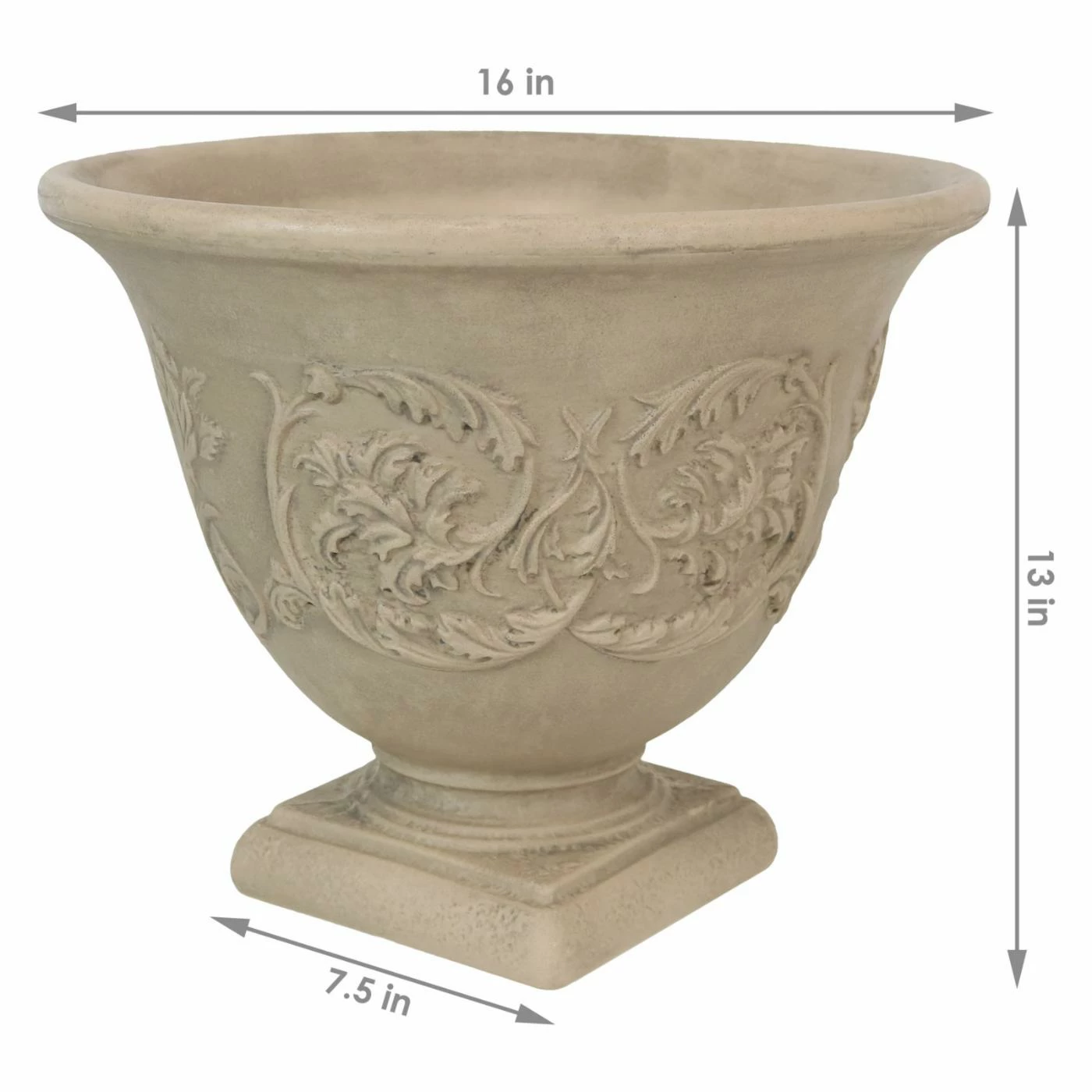 For a traditional look, the footed Sunnydaze Decor Darcy Heavy Duty Double-Walled Fade Resistant Flower Pot Planter features a flared lip and raised botanical design. This is a lightweight yet weather-resistant resin planter with a double-walled design and drainage holes. It’s offered in your choice of available hand-painted finish and quantity options.