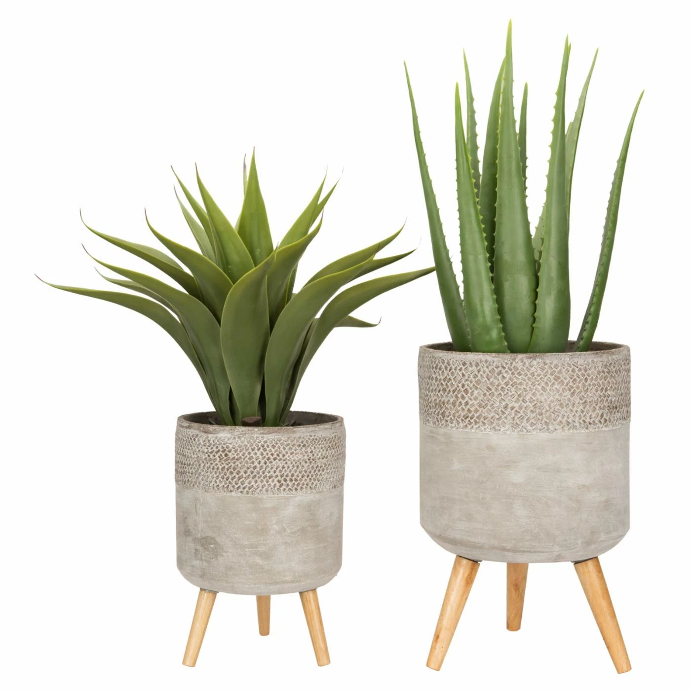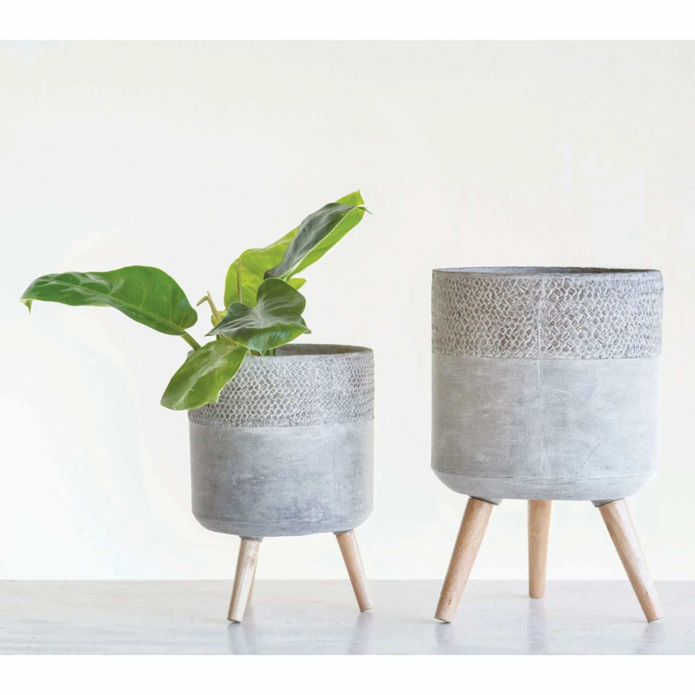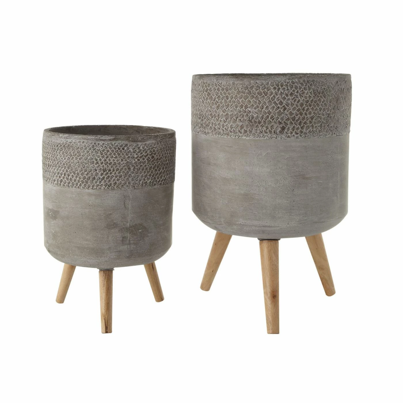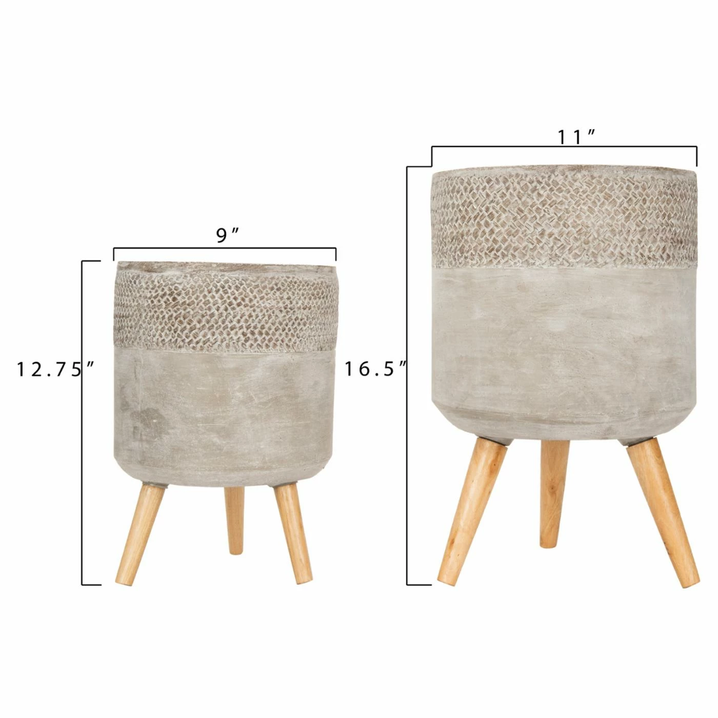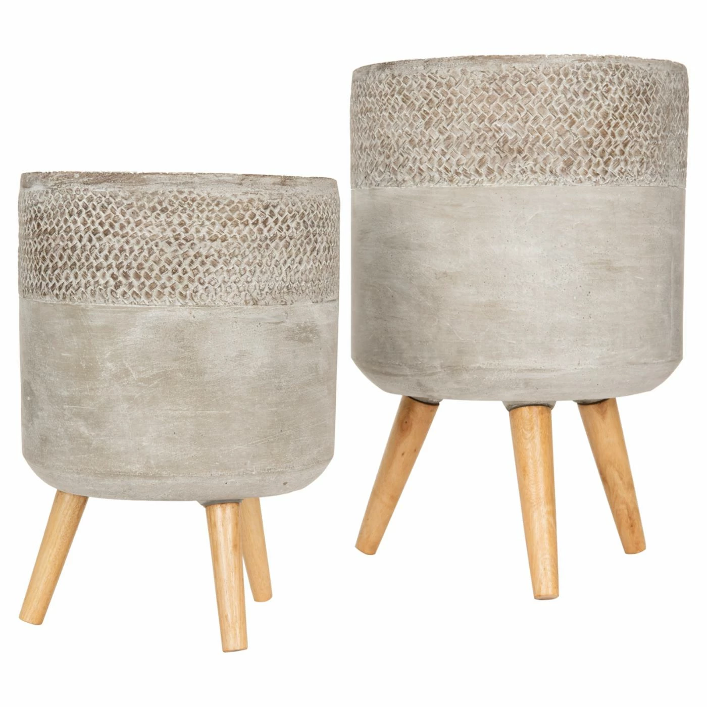 The 3R Studios Cement Planter with Removable Wood Legs – Set of 2 features one large and one small pot, for all of your indoor plants. The bowl of this planter is constructed from concrete with a distressed finish and weave pattern on top. The removable tapered wood legs holding up the planter are finished in natural brown.